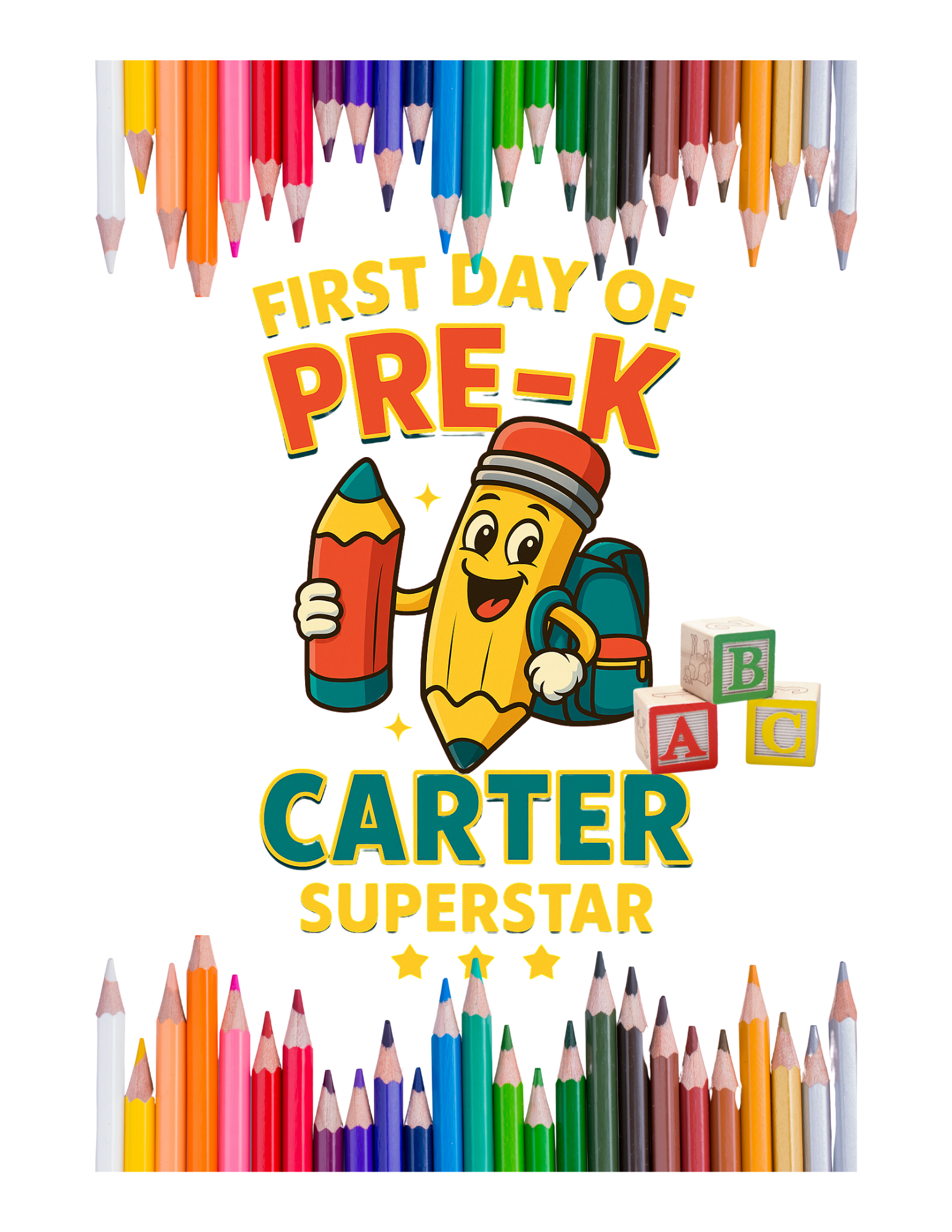 This custom shirt features a fun, animated pencil holding a crayon and a backpack. It's bursting with vibrant school-themed colors, and Carter’s name is printed front and center in a bold, playful font. It’s the perfect outfit for your child to feel proud, confident, and picture-day ready!